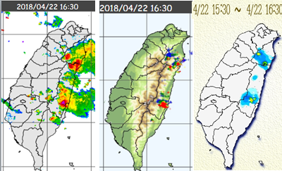 圖:昨(22)日16:30雷達回波合成圖(左圖)顯示,北部山區及花蓮山區有強回波發展;16:30閃電偵測圖(中圖)在相對映位置上皆有閃電發生(紅色為5分鐘內的閃電、黃色為前5至10分、綠色為前10至30分、藍色為前30至60分);時雨量累積(右圖)有小範圍較大的雨勢;顯示其為午後局部性的雷陣雨。 |
