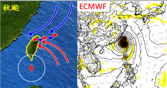 左圖:「秋颱」是指颱風由東而西通過台灣南端或巴士海峽,其外圍環流(或環流)有能力輸送暖濕空氣,與北方東北風在北台灣產生輻合作用,加上地形抬升,常在北部、東北部累積大量致災性的雨水。 右圖:最新(6日20時)歐洲中期預報中心(ECMWF)模式模擬顯示,第10天(16日20時)的模擬,有一很強的熱帶擾動已行進至台灣南端。(圖擷自tropical tidbits) |