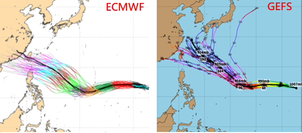 關島東方遠海的熱帶低壓,已於昨(7日)晚20時發展為輕颱「山竹」,最新歐洲及美國(NCEP GFS)模式模擬顯示,「山竹」受太平洋高壓的氣流所導引,偏西再轉西北西進行;沿途環境高低層風切小、海洋熱含量(OHC)大,將一路增強直到台灣附近,極可能是今年鄰近台灣強度最強、威脅最大的一個。最新歐洲系集模擬(ECMWF 左圖),其系集成員大致都比美國系集模擬(GEFS右圖)的成員偏南。各模式系集成員顯示的預測路徑還算集中,並不是很分散;所以,即使完整考慮各模式系集模擬的不確定性,下週六(15日)起三天,其威脅台灣的機率相當高,絕不可輕忽。但終究是第8至10天的模式模擬,仍應隨時注意最新資料,也要跟上模式不斷的微調。