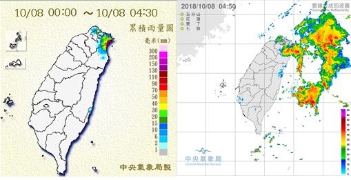 圖:今(8)日 4:30雨量累積圖(左圖)及4:50雷達監測資料(右圖)顯示,東北部有較明顯降雨,北海岸、大台北也有局部降雨的現象。 |