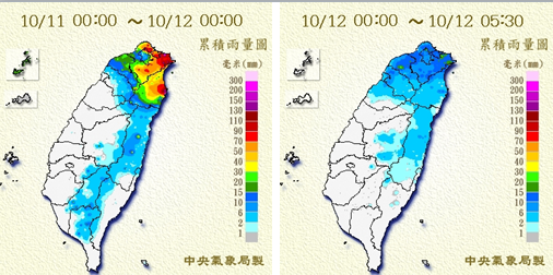 昨(11)日北台灣陰涼有雨,南部白天微熱、高溫仍在32度;新竹以北有雨,北部山區、東北角有豪雨,午後南部及花蓮山區有明顯降雨(左圖),今(12日)晨北台灣都會區低溫,首度降至20度以下,空曠地區更降至18度左右(截至5:30最低溫:台北市19.2度、淡水17.8度);今晨苗栗以北、宜花、中部山區有明顯降雨(右圖)。昨日至今晨5:30時最大累積雨量,北市山區擎天278毫米、新北大粗坑244毫米、宜蘭大里國小206毫米。因大氣型態改變不大,今、明(12、13日)兩天仍應注意氣象局的特報及「東北季風異常降水」所帶來的影響。