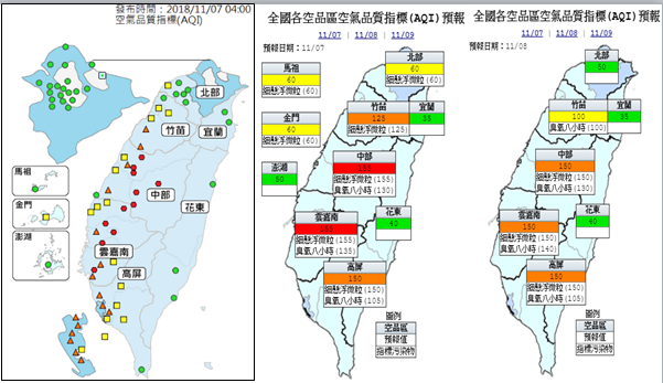 圖:環保署今(7日)晨4時監測資料顯示,苗栗以南空氣品質不佳,為對所有族群不健康或敏感族群不健康(左圖)。環保署昨(6日)晚22時預測測資料顯示,今、明兩天竹苗以南空氣品質也不佳(右圖)。 |