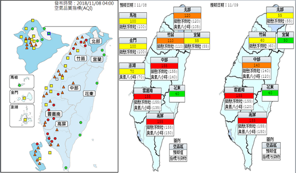 西部暖熱空汙嚴重 明日北台轉溼涼吳德榮2018/11/8 《本專欄轉載自「三立準氣象·老大洩天機」,引用請註明》今(8)日清晨4時環保署監測資料顯示,西半部空汙嚴重,為紅色(對所有族群不健康)或橙色(敏感族群不健康)居多(左圖)。昨(7日)晚22時預測測資料(右圖)亦顯示,今西半部空氣品質不佳,呼籲户外活動應注意;明(9)日南下的東北風比較弱,北部空汙可獲改善,但對中南部改善就很有限了。