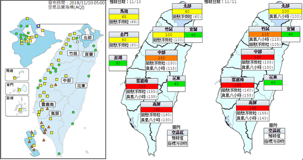 昨(9)日東北風南下,帶來乾淨的空氣,一路取代籠罩西半部的髒污空氣,環保署今(10日)晨5時監測資料(左圖)顯示,台南以北空氣品質(AQI)皆已獲得明顯改善,為「普通」至「良好」等級,以南則因地形屏障、風力微弱,仍有10站為橙色提警(敏感族群不健康)。環保署最新(9日22時發布)預測,週末(10、11日)AQI顯示,中南部因地形屏障、風力微弱,AQI仍為橙色提警(敏感族群不健康)或紅色警示(對所有族群不健康)居多,戶外活動應注意。