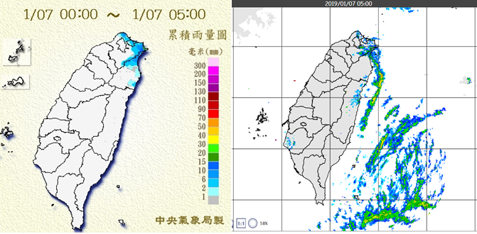 本週兩波東北季風 北台變化較明顯吳德榮2019/1/7 《本專欄轉載自「三立準氣象·老大洩天機」,引用請註明》今(7日)晨截至5:12,平地低溫:淡水16.6度(昨晨15.7度)、新竹17.4度(昨晨15.7度)、台北市(公園路氣象局站)17.8度(昨晨16.7度),顯示北台灣低溫比昨晨略升1度左右;嘉義則因「輻射冷卻」降至16.1度。截至5時雨量圖(左圖)顯示北海岸、北部山區、東北部降雨較明顯;5時雷達回波圖(右圖)則顯示,伴隨的降水回波強度皆很弱,陸地上主要分布在迎風面上。