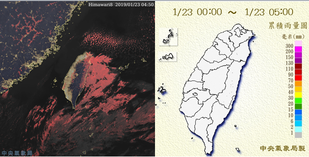 天氣晴朗早晚很冷 週六強冷氣團再襲吳德榮2019/1/23 《本專欄轉載自「三立準氣象·老大洩天機」,引用請註明》今(23日)晨4:50真實色調衛星雲圖(左圖)顯示,西半部晴朗無雲,東半部有結構鬆散的低層雲。西半部經一夜「輻射冷卻」作用,今晨截至5時,最低溫新竹峨眉7.2度(海拔87公尺)、淡水9.2度,嘉義10.2度;台北市都會區的最低溫亦降至10至12度(大安公園9.9度、氣象局12.0度) (部分低溫可能再降,請自行更新)。截至5時雨量資料(右圖)顯示,僅東半部有微量零星飄雨,很不明顯。