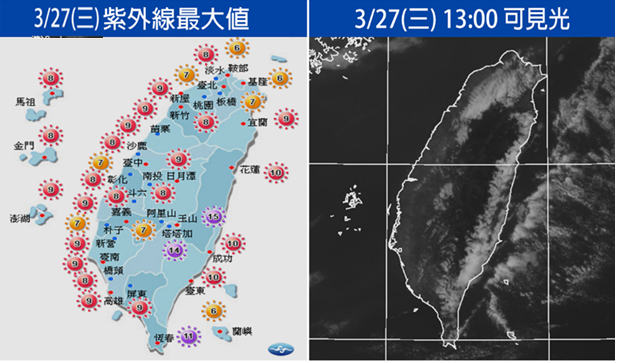 今暖熱 明午起轉濕涼 週日第二波到吳德榮2019/3/28 《本專欄轉載自「三立準氣象·老大洩天機」,引用請註明》昨(27日)各地紫外線的觀測最大值:西半部平地大多為過量級,高山則達危險級(左圖)。昨日13時可見光雲圖(右圖)顯示北部及東半部有一些低層雲,對陽光略有阻礙。由於「春分」剛過,陽光仍直射赤道附近,未來陽光會愈來愈北偏,只要天氣晴朗,紫外線就會愈來愈強。至於紫外線在高山比平地強,主要是大氣隨高度上升,密度減小得很快,所以高山所接受到的紫外線比平地強很多。