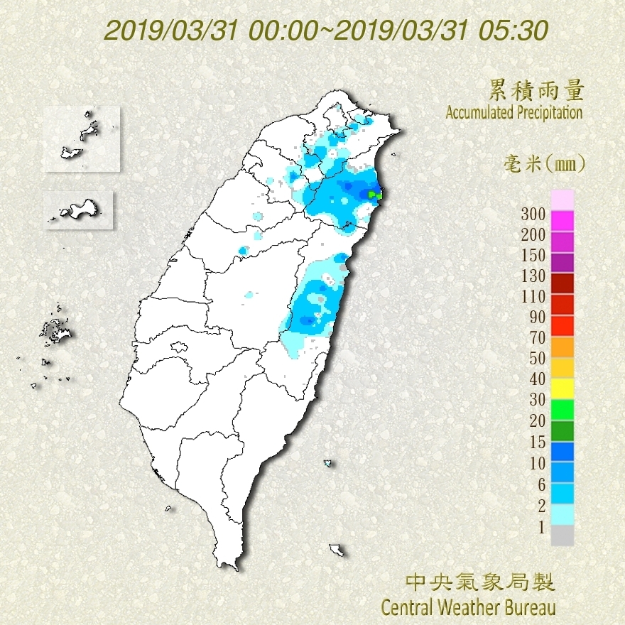 圖:今(31日)晨5:30累積雨量圖顯示,北部、東北部及東部有局部雨,中部以北山區亦有一些,比較零星。 |