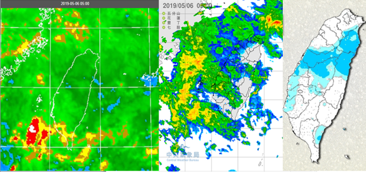 今明鋒面影響 各地有陣雨稍轉涼吳德榮2019/5/6 《本專欄轉載自「三立準氣象·老大洩天機」,引用請註明》今(6日)晨5時紅外線衛星雲圖顯示,台灣上空層狀雲籠罩(左圖);雷達監測大多為偏弱的降水回波(中圖);累積雨量圖則顯示,各地皆有降雨,雨量不大(右圖)。今晨北台灣平地最低溫約在19、20度(桃園大溪19.8度、新北五股19.9度)。台北市區的低溫也在21、22度(信義區21.5度、大安公園21.6度)左右,與昨晨比、變化不大。