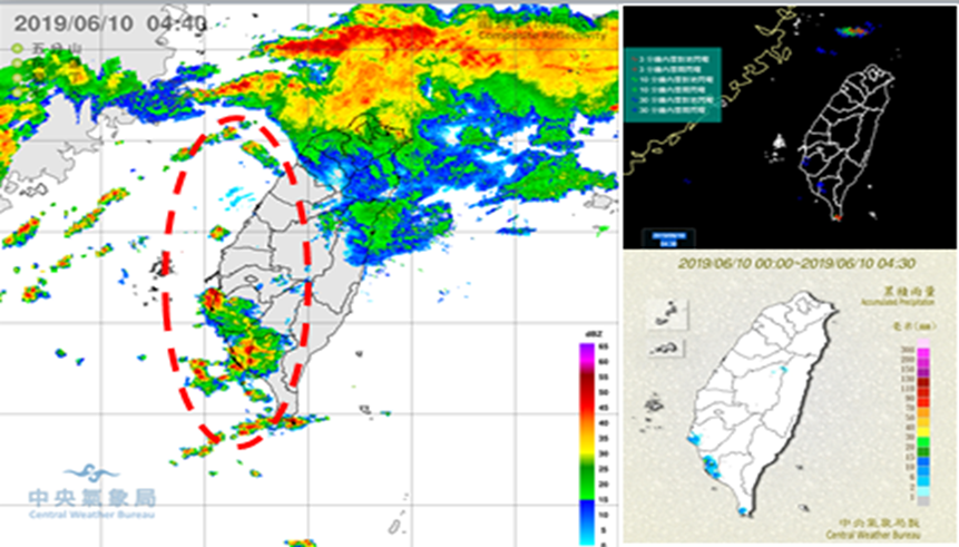 今趨不穩定 明起梅雨鋒影響吳德榮2019/6/10 《本專欄轉載自「三立準氣象·老大洩天機」,引用請註明》今(10日)晨4:40雷達回波圖(左圖)顯示,台灣北部海面有鋒面附近所形成的帶狀回波,伴隨活躍的閃電(右上圖);西南沿海亦有西南風受地形阻礙產生的回波,4:30雨量圖(右下圖)顯示,西南部及山區有局部降雨。由於在鋒前暖氣團內,氣溫比昨晨暖,截至5:38北台灣平地最低溫約在25度(桃園大溪25.0度、新北新店25.3度),台北市區最低溫則在26度(大安公園25.7度)左右。