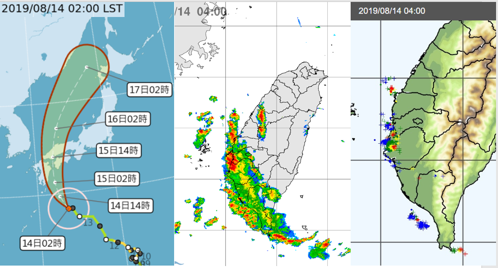 圖:中央氣象局最新(14日2時)「潛勢預測圖」(左圖)顯示,輕颱「柯羅莎」向北北西轉北,明(15)日通過九州、四國、本州西南部一帶。今(14日)晨4時雷達合成圖(中圖)顯示,中南部有較強回波,伴隨密集的閃電(右圖)。 |