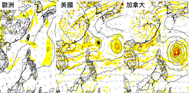 圖:下週四(22日)20時各國模式〔歐洲ECMWF(左圖)、美國GFS(中圖)、加拿大CMC(右圖)〕模擬顯示,在菲律賓東方海面,有熱帶擾動發展的跡象,但由於是7天的模擬,皆已累積相當大的誤差;各國模擬的位置、強度皆不相同。(圖擷自tropical tidbits) |