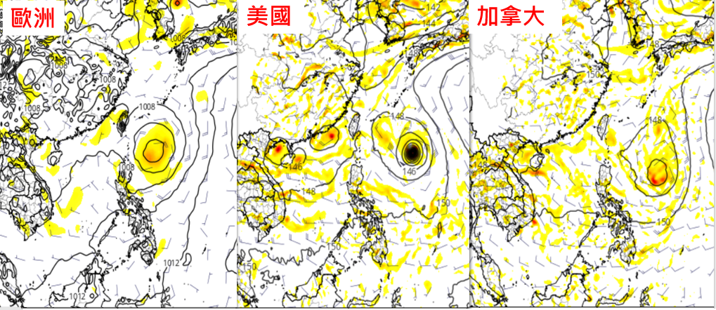下週五(23日)20時各國模式(歐洲ECMWF、美國GFS、加拿大CMC)模擬顯示,在菲律賓、台灣東方海面,已有颱風生成的機率大幅提高(圖),但由於是7天的模擬,皆已累積相當大的誤差;再加上各國模擬的位置、強度皆不相同;現在討論它對台灣的影響,不確定性過大,並不適宜!需再觀察。
