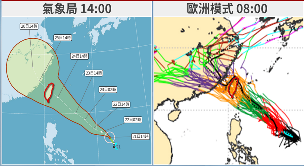 圖:今(21)日14時「中央氣象局」的預報資料,菲律賓東方海面上熱帶性低氣壓已發展成第11號颱風「白鹿」,預測其未來朝台灣而來(左圖);最新(21日8時)歐洲系集模式(ECMWF)顯示,50次模擬路徑分布在北從北部近海、南至台灣南端近海,其中則有大量的模擬路徑通過台灣(右圖)。 |