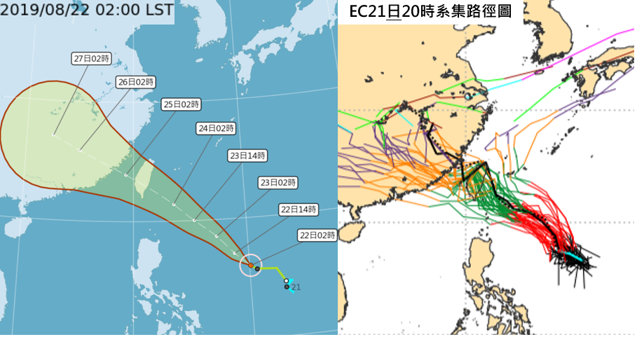潛勢預測圖 該用來強調登陸地點嗎吳德榮2019/8/22 《本專欄轉載自「三立準氣象·老大洩天機」,引用請註明》「中央氣象局」今(22)日2時的「路徑潛勢預測圖」(左圖)顯示,第11號颱風「白鹿」受太平洋高壓導引,大致向西北進行,週六、日(24、25日)侵襲台灣的機率很高;但由不確定的範圍(紅框)顯示,其中心在宜蘭、花蓮、台東登陸,甚至於南端近海通過,都有可能!最新(21日20時)歐洲系集模式(ECMWF)顯示,50次模擬路徑分布也是北從北部海面、南至台灣南端近海,其中則有大量的模擬路徑通過台灣(右圖),亦顯示「白鹿」侵台的機率很高,兩者在意義上是相通的。但若在詮釋時,只因昨日下午的「路徑潛勢預測圖」,中間那條線通過花蓮,就刻意說成「穿心颱」;那麼今晨微調為通過台東,又要說成「什麼颱」?明顯錯誤使用「路徑潛勢預測圖」。甚至於更進一步利用那條線去預估各地的風雨,完全忽視預報誤差的存在,更是不符合科學的行為!媒體報導時,應謹慎選擇訊息來源,以免把自己變成誤導民眾的幫凶。