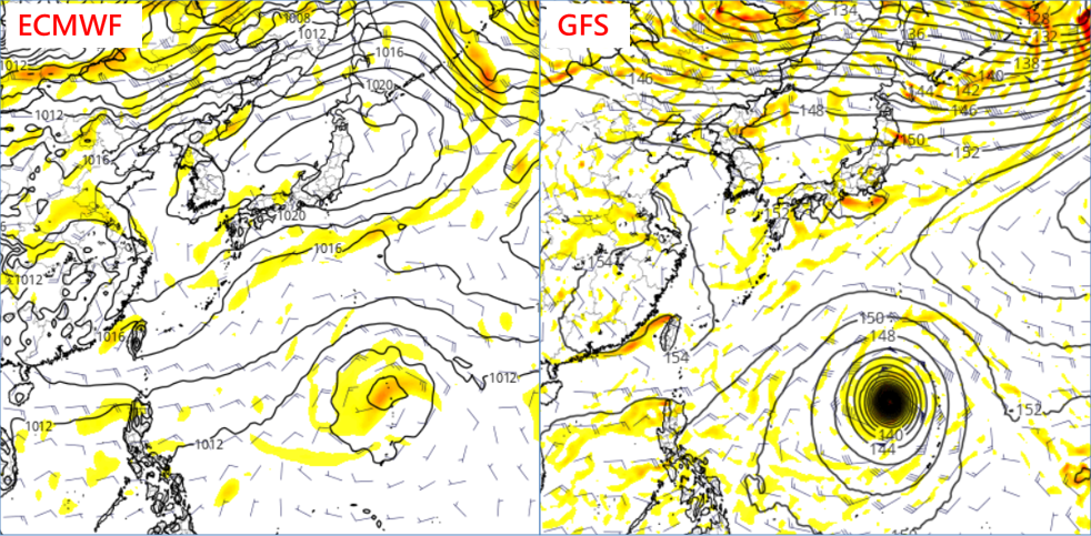 最新(2日20時)歐洲(ECMWF)、美國(GFS)模式模擬顯示,下週二(8日)前後,關島附近已有「熱帶擾動」發展的跡象;下週三(9日)20時歐洲(左圖)、美國(右圖)的模擬圖,由於運算時間已達1週、誤差累積,故其位置、強度不盡相同;其未來動向,「不確定性」更大。且各模式皆在調整中,討論其是否影響台灣?言之過早!需持續觀察。