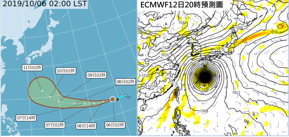 圖:今(6日)晨2時中央氣象局「路徑潛勢預測圖」(左圖)顯示,熱帶性低氣壓已發展成颱風,命名為「哈吉貝」、今年第19號;其未來向西轉西北西、再轉西北進行。最新(5日20時)歐洲(ECMWF)模式模擬12日20時,「哈吉貝」位置大約在琉球東北方、日本南方附近海面(右圖 擷自tropical tidbits)