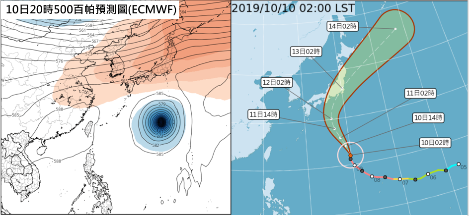 右圖:中央氣象局10日2時「路徑潛勢預測圖」顯示,「哈吉貝」沿太平洋高壓邊緣,在日本南方海面迴轉;再逐漸進入西風帶,轉向東北加速;強度將逐漸減弱,週末(12、13日)將以「中颱」之姿,暴風圈掃過日本關東。