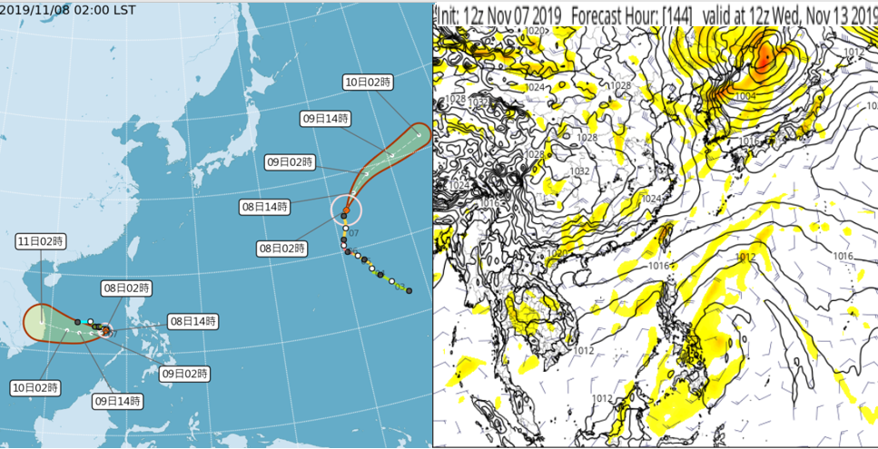 左圖:中央氣象局8日2時「路徑潛勢預測圖」顯示,中颱「哈隆」在日本的東南方遠海,愈往東北,將持續減弱、變性;另外,輕颱「娜克莉」偏西往越南。 右圖:最新模式模擬顯示,下週三(13日)前後,菲律賓東方海域仍有熱帶擾動生成的跡象;但大氣型態已不利於其靠近東亞大陸,僅能在低緯度活動。(擷自tropical tidbits) |