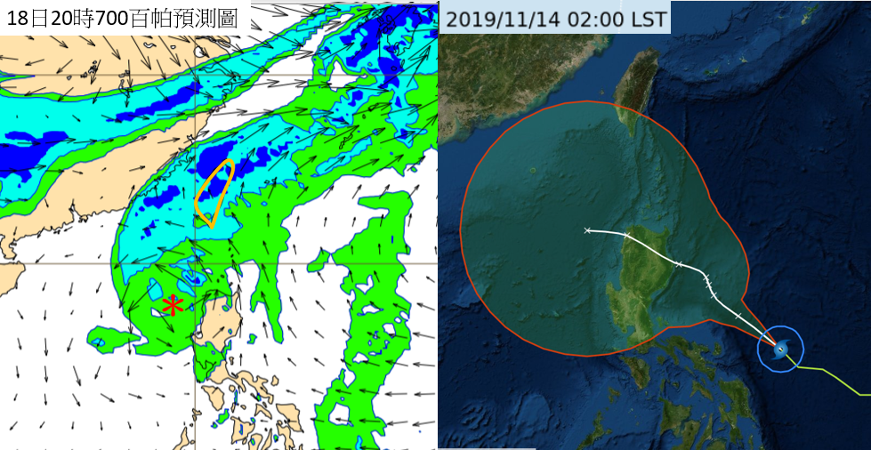 左圖:最新(13日20時)歐洲中期預報中心(ECMWF)模式,模擬18日20時700百帕天氣圖顯示,中層雲系覆蓋台灣上空,迎風面降雨增多,背風面(西半部)則也帶來局部零星降雨的機率。 右圖:中央氣象局14日2時「路徑潛勢於測圖」顯示,第26號颱風「海鷗」,未來朝呂宋島北端前進,因結構不對稱,其預測路徑的「不確定性」(紅框)很大。 |