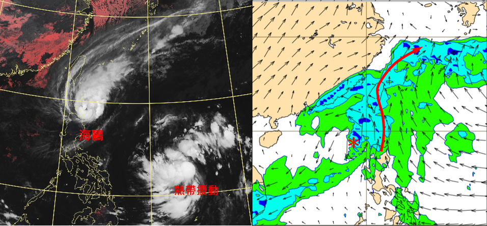 中央氣象局今(19日)晨2時「路徑潛勢預測圖」顯示,第26號颱風「海鷗」,正在呂宋島東北方近海,未來轉向西南西,通過呂宋島進入南海。今晨真實色衛星雲圖顯示,菲律賓東方海面的熱帶擾動正在發展(左圖);最新歐洲模式仍持續模擬,週三、四前後有機率發展成颱,亦將通過呂宋島進入南海。週五的模擬圖(右圖)顯示,其輸送中層水氣繼續通過台灣上空;同時台灣附近低層大氣仍受東北風影響,以致類似的降雨型態持續至週日。下週一(25日)又有下一波東北季風南下。