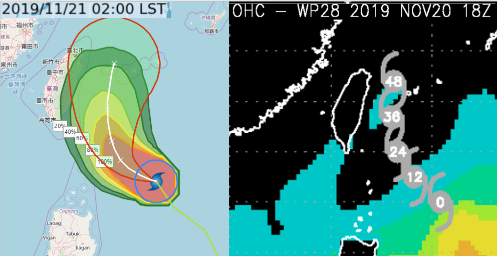 圖:中央氣象局今(21日)晨2時「路徑潛勢及暴風圈侵襲機率圖」(左圖)顯示,第27號颱風「鳳凰」,在菲律賓東方海面向西北西,進行至台灣東側北轉,48小時減弱為熱帶低壓。但由於巴士海峽至台灣附近「海洋熱含量」(右圖)低,不利其強度的維持。(右圖擷自RAMMB) |