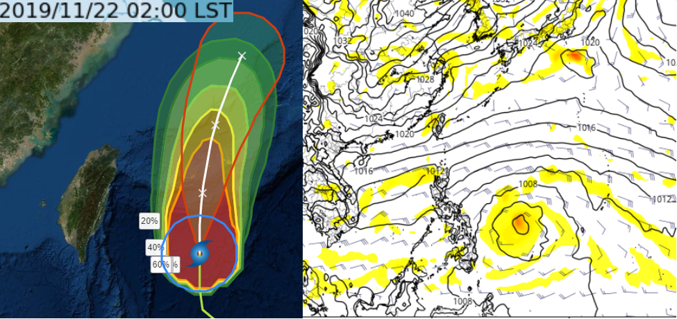 圖:中央氣象局今(22日)2時「路徑潛勢及暴風圈侵襲機率圖」(左圖)顯示,第27號颱風「鳳凰」,在台灣東側海面向北轉北北東進行,強度將漸減弱。最新(21日20時)歐洲中期預報中心(ECMWF)模式,模擬下週三(27日)20時地面圖(右圖)顯示,菲律賓東方海面仍有熱帶擾動發展的跡象。(右圖擷自tropical tidbits)