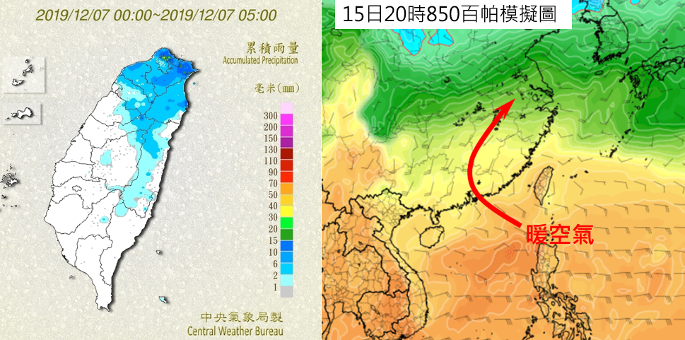 圖:今(7日)晨5時雨量圖顯示,降雨的範圍與強度明顯減小,中南部平地降雨已先停歇(左圖)。最新(6日20時)歐洲中期預報中心(ECMWF)模式模擬顯示,下週(15)日模擬圖(右圖)顯示,暖空氣向北擴展(紅箭),明顯偏暖。 |