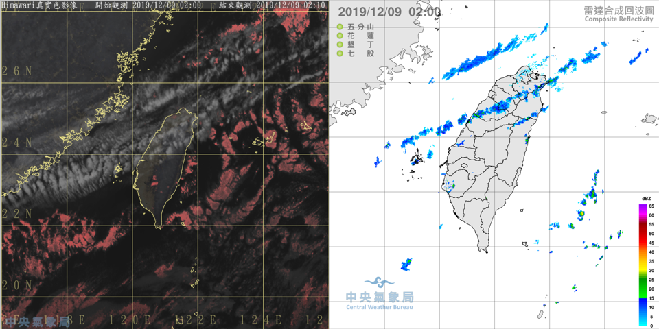 白天起回暖 明晚東北風南下吳德榮2019/12/9 《本專欄轉載自「三立準氣象·老大洩天機」,引用請註明》今(9日)晨2時真實色雲圖(左圖)及雷達合成回波圖顯示(右圖),北台灣雲層增多,部分地區的長波輻射冷卻作用略受影響,大台北低溫約在12、13度(新北深坑區11.5度、台北文山區13.1度)、桃園大溪區11.2度,皆較昨(8日)晨略回升。新竹以南輻射冷卻作用仍強,平地((≦200公尺)持續出現10度以下低溫(新竹寶山7.9度、苗栗西湖8.2度、南投中寮9.7度、雲林崙背9.2度、台南佳里區、下營區9.7度),花東亦有10度以下低溫(花蓮光復8.5度、台東鹿野9.4度)。