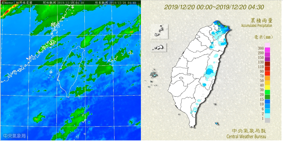 圖:今(20日)晨4:30紅外線色調強化雲圖(左圖)顯示,中層雲系(淺綠、淺藍色)由南方移入。截至4:30降雨仍以低層東北風迎風面的北部、東北部及花東為主(右圖)。 |