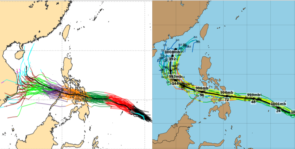 圖:最新(21日20時)歐洲中期預報中心(ECMWF)系集模式(左圖),及美國(GFES)系集模式(右圖)皆模擬出其未來路徑通過菲律賓、進入南海;模式模擬的末期,有比較大的差異。(右圖擷自tropical tidbits) |
