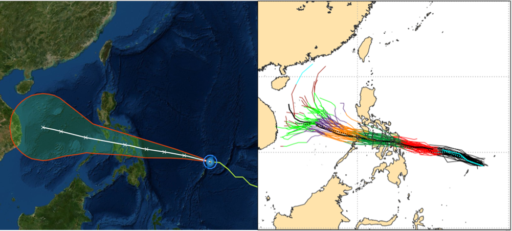 中央氣象局23日2時「路徑潛勢預測圖」(左圖)顯示,第29號颱風「巴逢」未來5天的路徑,通過菲律賓、進入南海,「不確定性」的範圍逐漸擴大(紅框),並無侵台機率。最新(22日20時)歐洲中期預報中心(ECMWF)系集模式(右圖)模擬出其未來路徑通過菲律賓、進入南海;模擬末期,系集成員(各條路徑)逐漸分散,顯示路徑預測的「不確定性」。所以相對於各條路徑,台灣發生的天氣也會不同,正由於這種「不確定性」的存在,模式模擬是需要被持續觀察的。