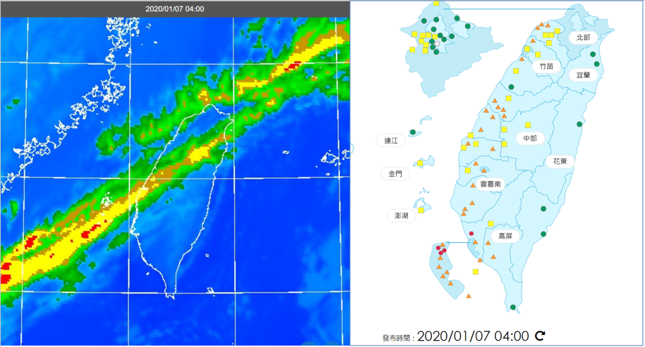 大氣穩定防空污 明氣溫遽降轉冷吳德榮2020/1/7 《本專欄轉載自「三立準氣象·老大洩天機」,引用請註明》今(7日)晨高空的卷層雲移至北台灣上空,中南部局部地區有低雲或霧存在,東半部近海亦有一些低雲(左圖)。西半部大氣穩定,空氣品質不佳(右圖)。冷空氣雖減弱,清晨輻射冷卻作用仍帶來偏低的氣溫;今晨截至5時:桃園以南各地區平地最低溫約在14、15度左右(桃園大溪區14.2度、新竹峨眉13.7度、苗栗西湖14.2度、雲林崙背14.0度、高雄內門區13.5度)。大台北平地最低溫則在16、17度(新北新店區15.6度、台北大安區17.5度)。(若再降請自行更新)