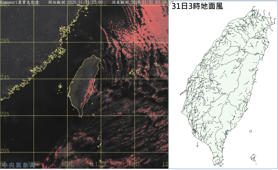 圖:今(31日)晨3時衛星雲圖顯示陸地上晴朗無雲(左圖),平地風力微弱(右圖),昨晚至今晨「輻射冷卻」作用強且持續時間長,降溫幅度大;再加上原本冷空氣的勢力還很強,再破入冬最低溫紀錄。(圖擷自CWB & NCDR) |