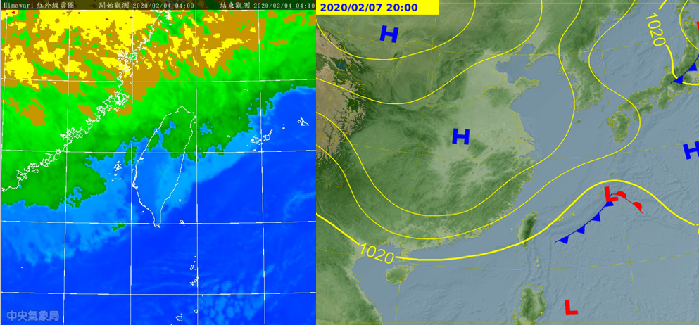 今(4日)晨鋒面接近,北台灣雲量增多(左圖),已無「輻射冷卻」的貢獻,故清晨低溫反較昨晨回升;中南部冷空氣減弱、「輻射冷卻」亦略減弱,最低氣溫也較昨晨回升。截至5時平地最低氣溫依序為:高雄內門區11.2度、台南後壁區11.3度、嘉義東區11.9度;大台北平地的低溫則在14、15度(新北石門區14.1度、台北大安區15.3度)。