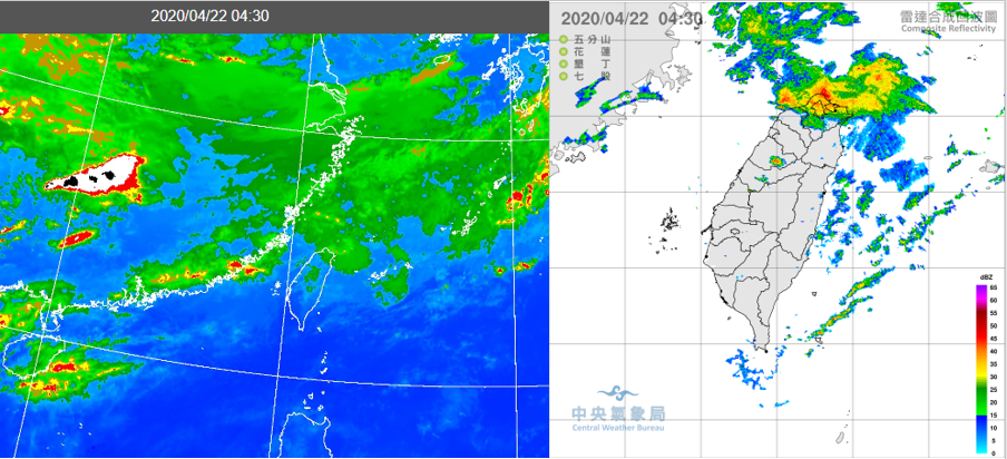 春雨綿綿北濕涼 氣溫逐日緩降吳德榮2020/4/22 《本專欄轉載自「三立準氣象· 老大洩天機」,引用請註明》今(22日)晨4:30衛星雲圖顯示,鋒面雲帶籠罩北台灣(左圖);雷達回波圖亦顯示,北部有明顯降水回波(右圖)。北部、東北部及東部有局部雨。冷空氣南下,北台灣降溫較明顯,截至5:04平地的最低氣溫如下:北部16度(新北石門區16.4度)、中部19度(台中神岡區18.5度)、南部20度(台南後壁區19.7度)、東部19度(宜蘭三星18.7度)。台北市18度(文山區18.2度)。