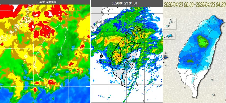 圖:今(23日)晨4:30衛星雲圖顯示,通過的鋒面雲系較昨日厚實(左圖);4:30雷達回波合成圖顯示,伴隨的降水回波亦較強(中圖);4:30累積雨量圖顯示,台南以北已有明顯降雨(右圖)。 |