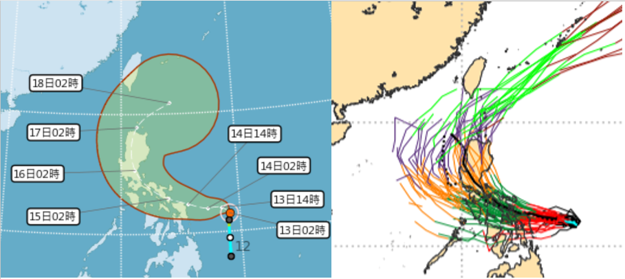 圖:今(13日)晨2時中央氣象局「潛勢預測圖」(左圖)及最新(12日20時)歐洲系集模式模擬(右圖)顯示,「黃蜂」未來在呂宋島附近向北迴轉,「潛勢預測圖」路徑以東的「不確定範圍(紅框)」及系集模式中較偏東的模擬路徑,距離台灣較遠;「潛勢預測圖」「潛勢預測圖」路徑以西的「不確定範圍」及系集模式中較偏西的模擬路徑,距離台灣較近。 |