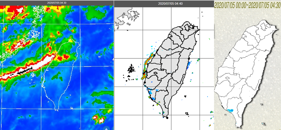 圖:今(5日)晨4:30紅外線雲圖顯示,台灣上空有稀疏的高層雲(左圖)。4:40雷達回波合成圖顯示,中南部沿海有零星回波(中圖)。4:30累積雨量圖顯示,西南部有少量的零星降雨(右圖)。 |