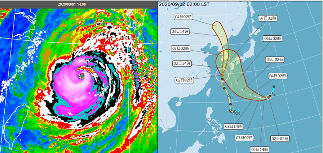 前梅莎後海神 皆連擊西日本韓國吳德榮2020/9/2 《本專欄轉載自「三立準氣象· 老大洩天機」,引用請註明》紅外線雲圖(左圖)顯示,昨(1)日14時已為「梅莎」最強的時刻;中央氣象局將其估為48米/秒,雖僅為「中度」上限,並未如部分國家(美、中國大陸⋯)將其估為「強烈」,但已是今年的最強颱風。中央氣象局2日2時「路徑潛勢預測圖」(右圖)顯示,「梅莎」在東海、強度略減弱;向北北東撲向韓國;今、明(2、3)日其暴風圈將先後掃過日本西部及韓國。另外,日本南方海面的「熱帶低壓」亦已於昨日20時發展為第10號颱風「海神」,將經「海洋熱含量」高的海域,而快速增強;最新「路徑潛勢預測圖」(右圖)顯示,向西轉西北再轉北北西,逐漸加速,6日暴風圈將通過日本西部一帶、7日掃過韓國。兩地皆在5天內,接連受到兩個這麼強的颱風重擊,史上未見,威脅之大自不在話下。