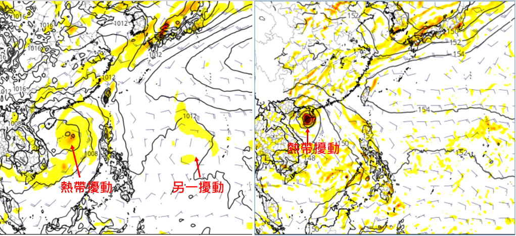 圖:最新歐洲(ECMWF左圖)模式及美國(GFS右圖)模式,模擬下週五(18日)20時天氣圖顯示,南海有熱帶擾動發展,模擬的動向皆對台無直接影響。另外,在菲律賓東方海面,兩模式亦皆模擬出7天之後,另有熱帶擾動醞釀的跡象,亦需一併觀察。(圖擷自tropical tidbits)