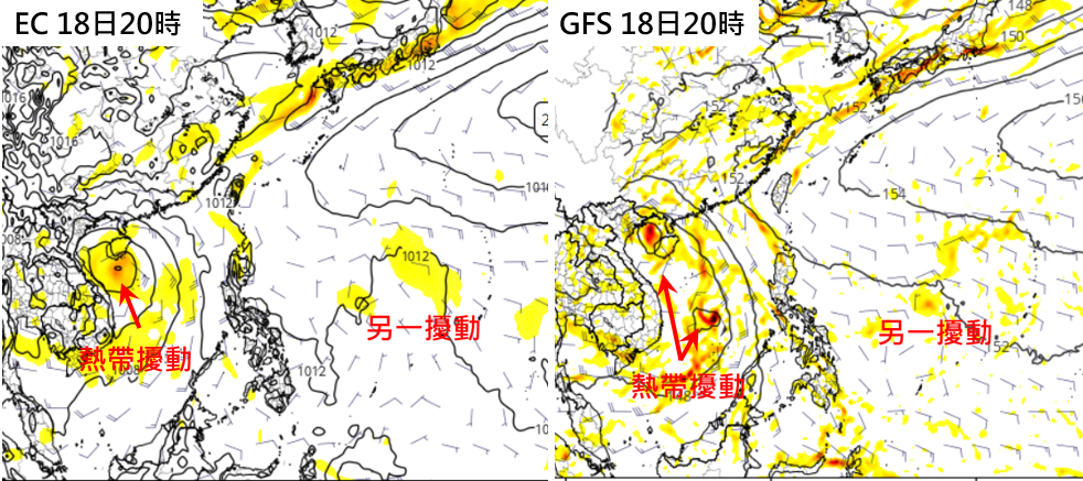 最新歐洲(ECMWF)模式及美國(GFS)模式,持續模擬出週四至週六(17至19日)南海有熱帶擾動發展,儘管模擬位置及強度皆有差異,模擬的行徑皆向西北西,通過海南島或其南方海面,登陸越南,對台無影響。如果模擬像歐洲模式(左圖),其外圍的水氣將匯入週六抵達的鋒面,而使雨勢增大;但如果模擬像美國模式(右圖),則其外圍的水氣對週六抵達的鋒面就無改變。由於是末期的模擬,理論上已有不容忽視的「不確定性」,需要持續觀察。另外,在菲律賓東方海面,兩模式亦皆持續模擬出6天之後,另有熱帶擾動醞釀的跡象,應是未來幾天觀察的重點