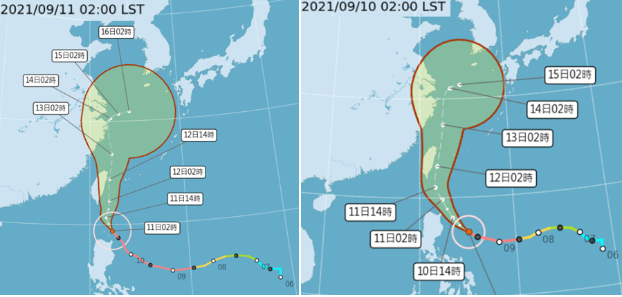 圖:中央氣象局最新(11日2時)「路徑潛勢預測圖」(左圖)顯示,受到「太平洋高壓」導引,向北北西轉北,沿台灣東側北上,「不確定性」範圍(紅框)已較昨日(右圖)明顯縮小。 |