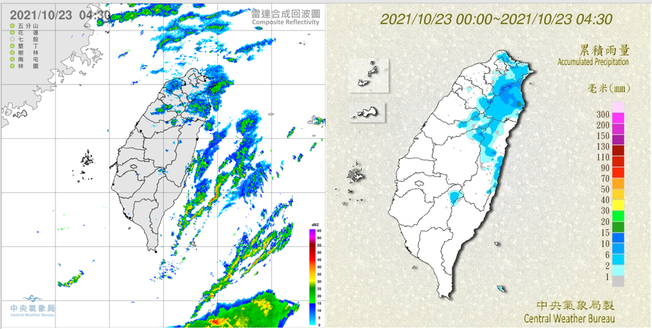 北台濕涼再兩天 下週一季風減弱吳德榮2021/10/23 《本專欄轉載自「三立準氣象· 老大洩天機」,引用請註明,切勿斷章取義、任意竄改》今(23日)晨截至4:47,平地最低氣溫出現在新北瑞芳區17.0度,其次為桃園楊梅區17.6度;其他各地區低溫:中部(台中大甲區)18.5度,南部(台南六甲區)19.7度,東部(宜蘭三星鄉)17.7度,台北市(文山區)低溫則在18.0度。今晨4:30雷達回波圖(左圖)顯示,苗栗以北有弱降水回波,迎風面山區有相對較強的持續性回波,故也帶來相對較大的降雨(右圖)。