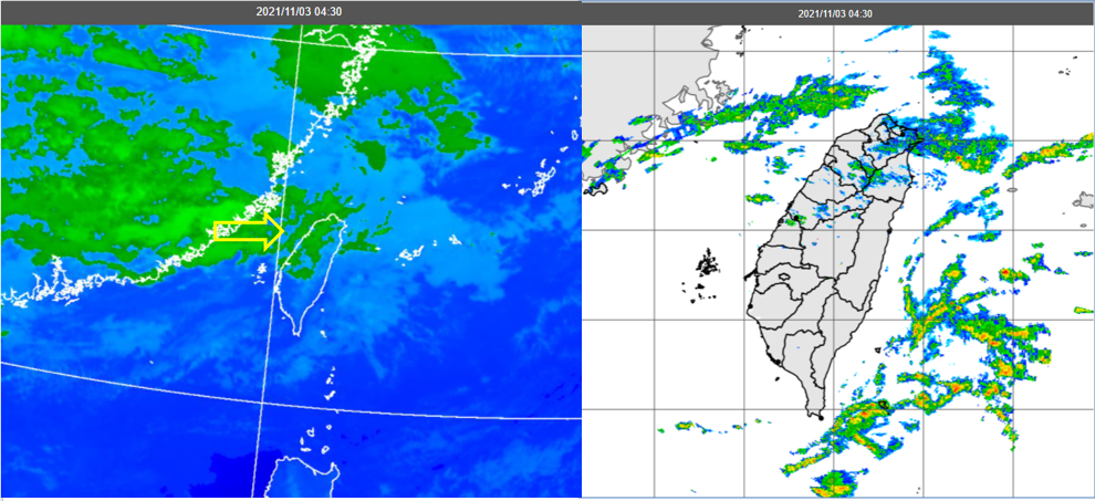 圖:今(3日)晨4:30紅外線色調強化雲圖顯示,華南中層雲系移出,通過台中以北地區(左圖)。4:30雷達回波合成圖顯示,東部海面上有降水回波,台中以北亦有零散且偏弱的降水回波(右圖)。 |