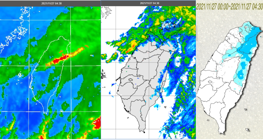 圖:今(27日)晨4:30紅外線色調強化雲圖顯示,東北風迎風面有較多低雲,台灣海峽有中雲移入(左圖)。4:30雷達回波合成圖顯示,北部、東半部海面有降水回波,台灣海峽亦有回波移入(中圖)。4:30累積雨量圖顯示,中部以北、東半部有局部雨,宜花降雨較明顯(右圖)。 |