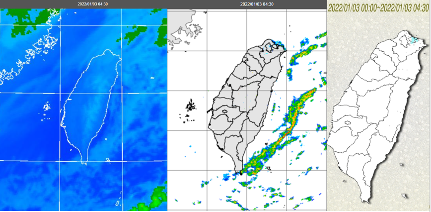 東北季風漸減弱 週四起再增強吳德榮2022/1/3 《本專欄轉載自「三立準氣象· 老大洩天機」,引用請註明,切勿斷章取義、任意竄改》 冷空氣雖漸減弱,因「強輻射冷卻」,今(3日)晨苗栗以南至台南,平地最低氣溫仍在11、12度,截至7時,其前3依序為:南投(中寮鄉)11.4度,台南(新化區)11.5度,苗栗(西湖鄉)11.6度。其他各地區平地最低氣溫:北部(新北石門區)13.9度,東部(花蓮壽豐鄉)11.5度。台北市(南港區)亦降至15.1度(再降請自行更新)。今日4:30紅外線色調強化雲圖顯示,北部及東部海面皆有的低雲存在(左圖);4:30雷達回波合成圖顯示,東部外海有較多的回波(中圖);今晨北海岸已有局部降雨(右圖)。