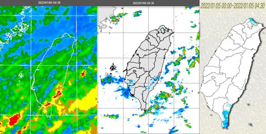 圖:今(5日)晨4:30紅外線雲圖顯示,中高雲由南向北逐漸增多(左圖)。4:30雷達回波合成圖顯示(中圖),東側海面有降雨回波,海峽南部亦有中高雲的微弱回波;北海岸及台東、恆春半島已有局部降雨(右圖)。