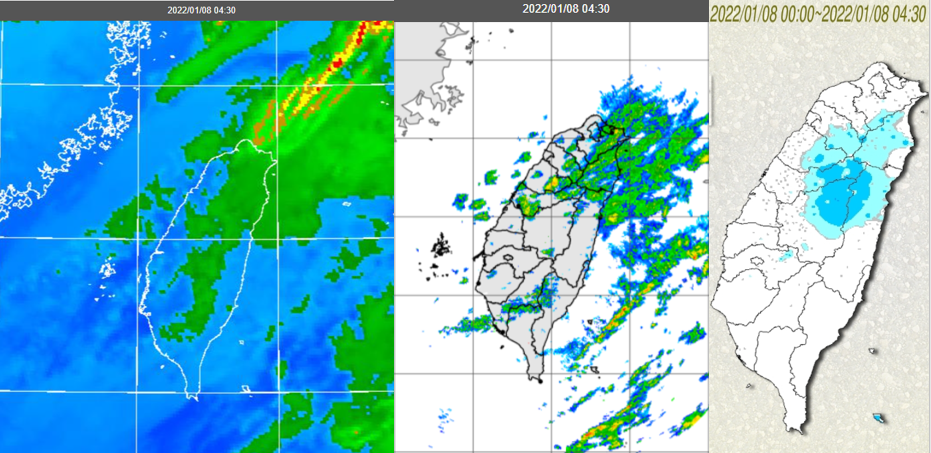 圖:今(8日)晨4:30紅外線雲圖顯示,中層雲即將通過(左圖)。4:30雷達回波合成圖顯示,中部以北及東側海面仍有弱降雨回波(中圖);今晨中部以北有局部少量降雨,山區較明顯(右圖)。 |