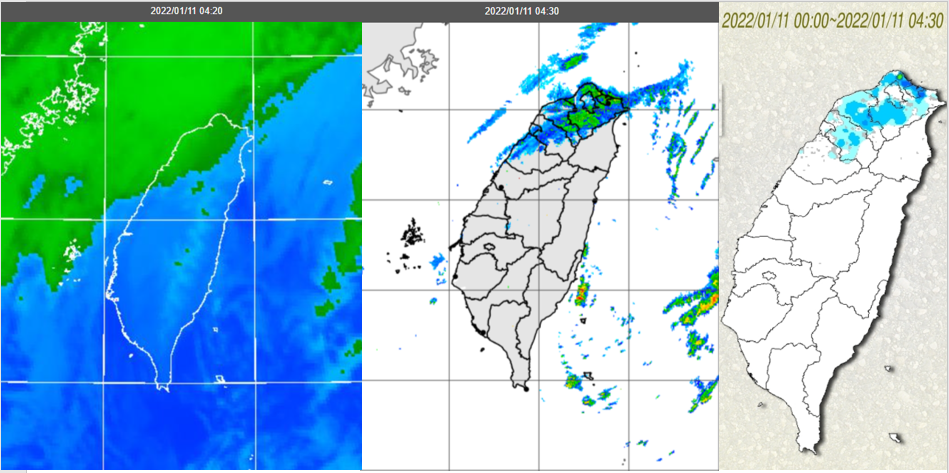 今愈晚愈冷 強冷空氣影響至週六晨吳德榮2022/1/11 《本專欄轉載自「三立準氣象· 老大洩天機」,引用請註明,切勿斷章取義、任意竄改》 今(11)晨4:20紅外線雲圖顯示,已有雲層影響北部(左圖)。4:30雷達回波合成圖則顯示,北部有降雨回波(中圖),伴隨局部降雨(右圖)。強冷空氣南下,北台氣溫急遽下降中,各地低溫尚未出現。